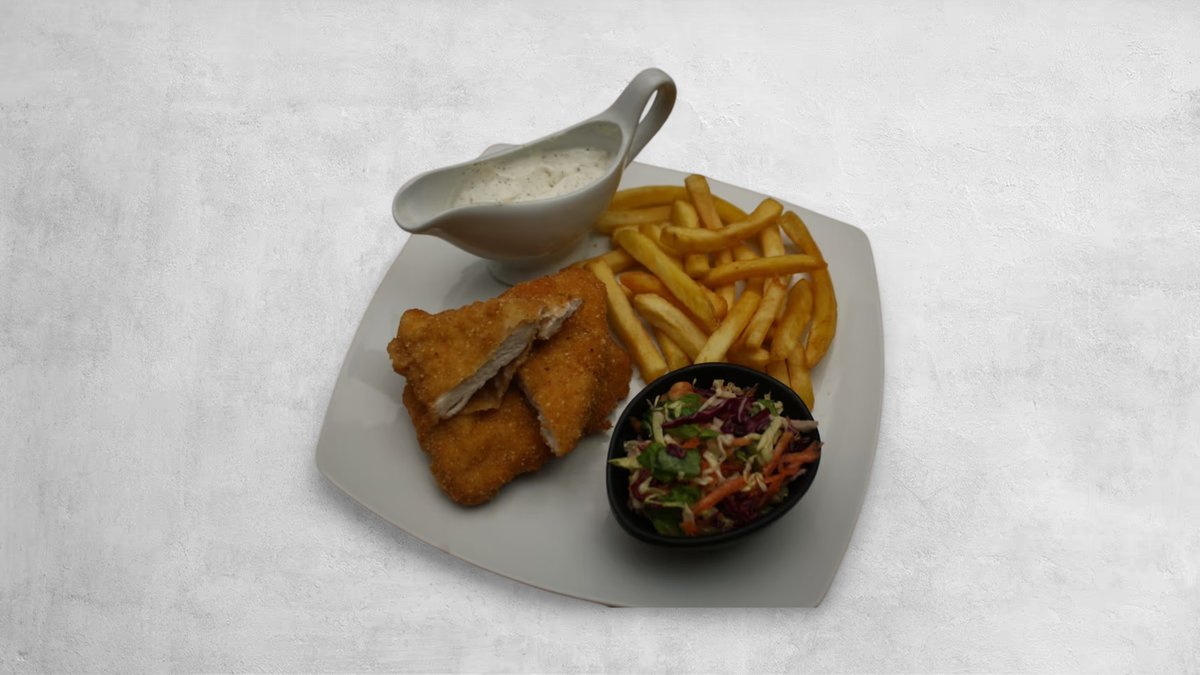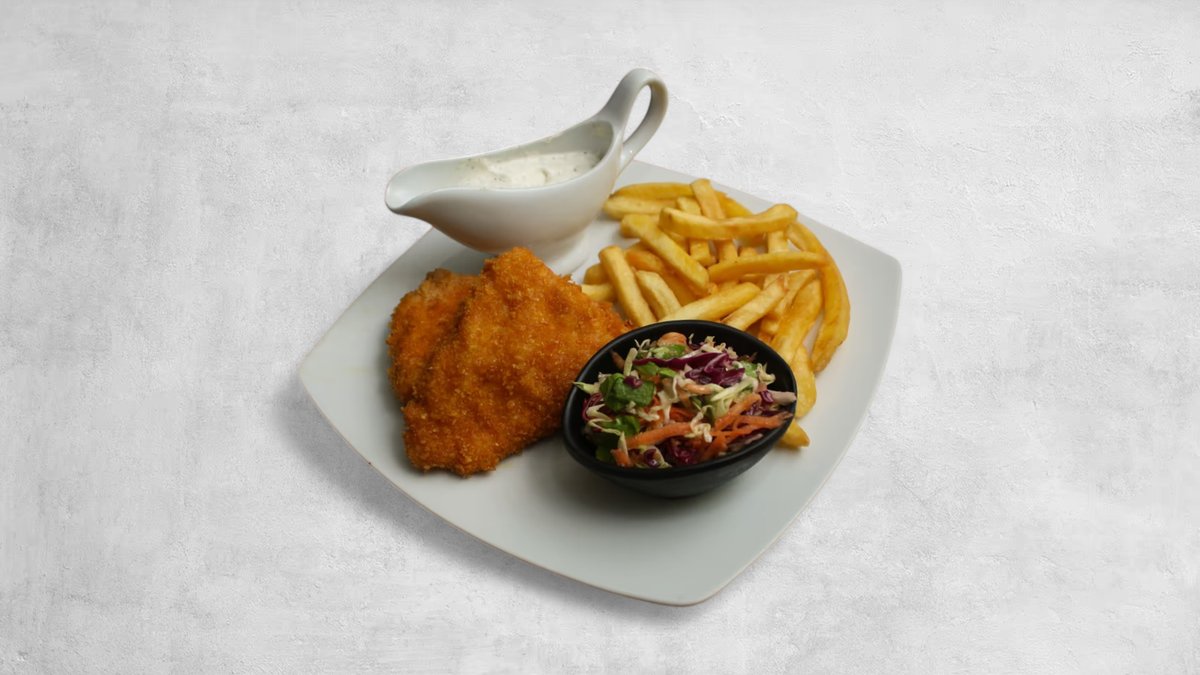 (200g, pileći belo, prezla, tartar sos, pomfrit, vitaminska salata, lepinja)