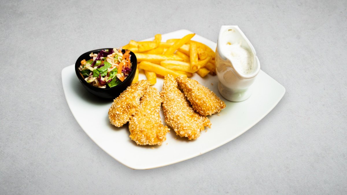 (200g, pileće belo, susam, tartar sos, pomfrit, vitaminska, lepinja)