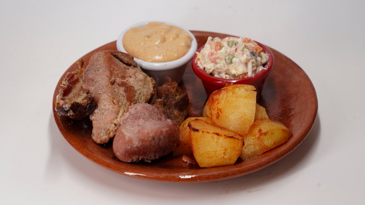 150g svinjskog mesa, 150g pekarskog krompira, somun. Svinjska plećka bez kostiju,pripremljena po starim recepturama na tradicionalan način u zemljanim posudama-saču.Tokom dugotrajne pripreme, prirodni sokovi i začini prožimaju meso, stvarajući bogat, pun ukus i miris domaće kuhinje. Savršeno zapečena spolja, a nežna i sočna iznutra – jelo koje se pamti i rado deli. Pažljivo sečen krompir, sporo pečen pod sačem dok ne dobije zlatno-hrskavu koricu i mekanu unutrašnjost. Prožet aromama začina i domaće pripreme, savršen kao prilog ili samostalno tradicionalno jelo.