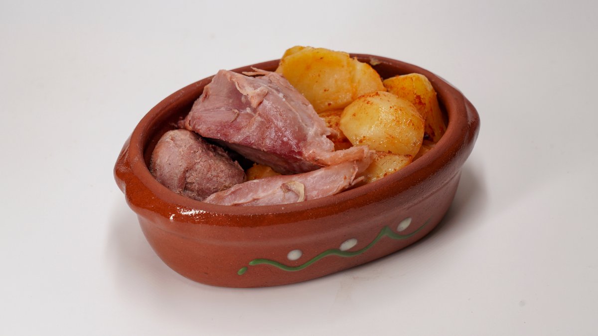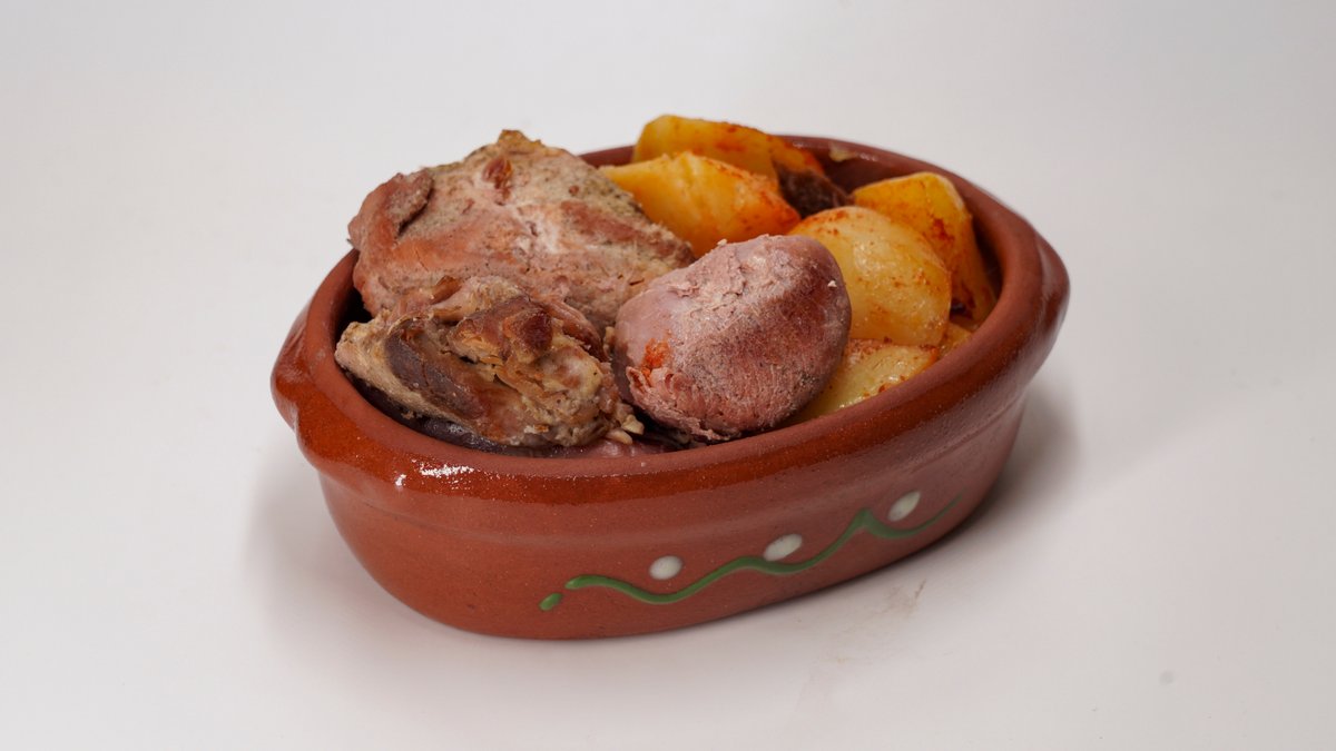 500g svinjskog mesa, 500g pekarskog krompira, somun. Svinjska plećka bez kostiju,pripremljena po starim recepturama na tradicionalan način u zemljanim posudama-saču.Tokom dugotrajne pripreme, prirodni sokovi i začini prožimaju meso, stvarajući bogat, pun ukus i miris domaće kuhinje. Savršeno zapečena spolja, a nežna i sočna iznutra – jelo koje se pamti i rado deli. Pažljivo sečen krompir, sporo pečen pod sačem dok ne dobije zlatno-hrskavu koricu i mekanu unutrašnjost. Prožet aromama začina i domaće pripreme, savršen kao prilog ili samostalno tradicionalno jelo.