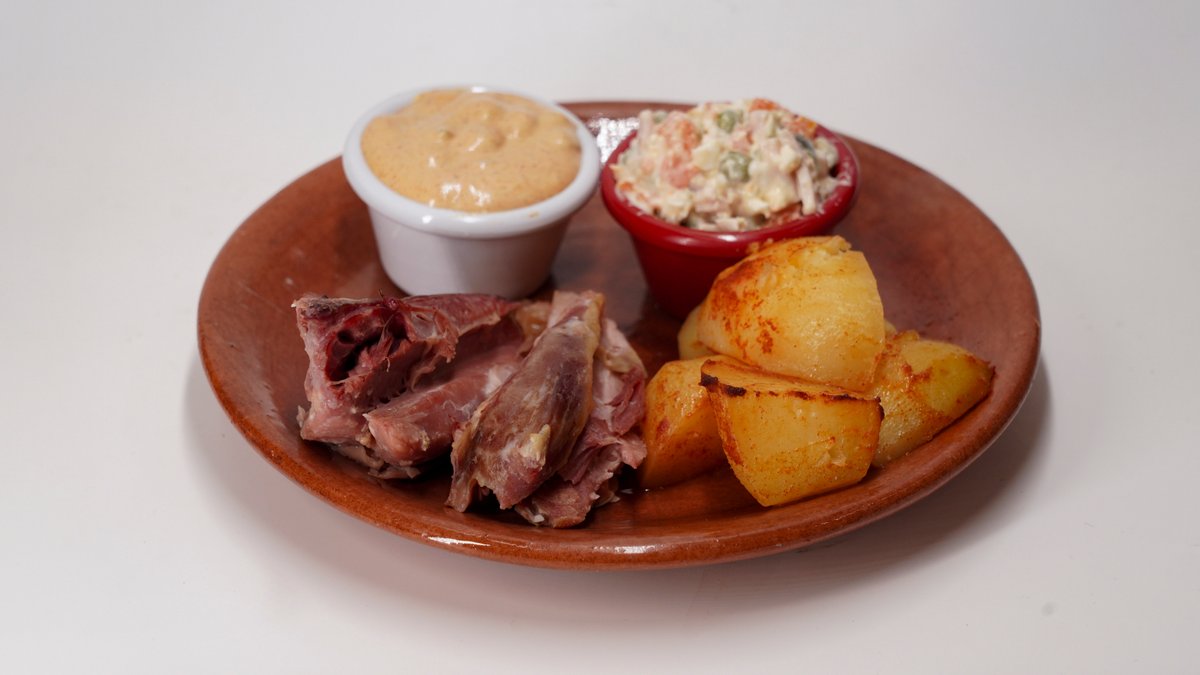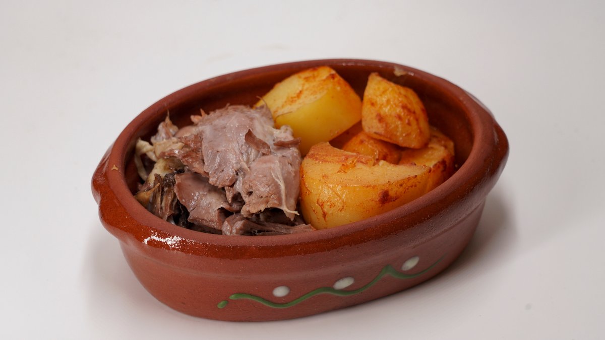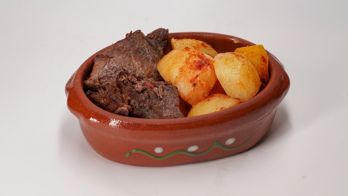 500g junećeg mesa, 500g pekarskog krompira, somun. Juneća plećka,pripremljena po starim recepturama na tradicionalan način u zemljanim posudama-saču.Sporo pečena juneća plećka pod sačem, izuzetno mekana i sočna, prožeta bogatim aromama začina i domaće kuhinje. Savršen spoj tradicionalne pripreme i punog ukusa. Pažljivo sečen krompir, sporo pečen pod sačem dok ne dobije zlatno-hrskavu koricu i mekanu unutrašnjost. Prožet aromama začina i domaće pripreme, savršen kao prilog ili samostalno tradicionalno jelo.