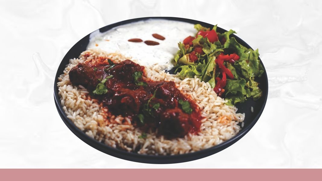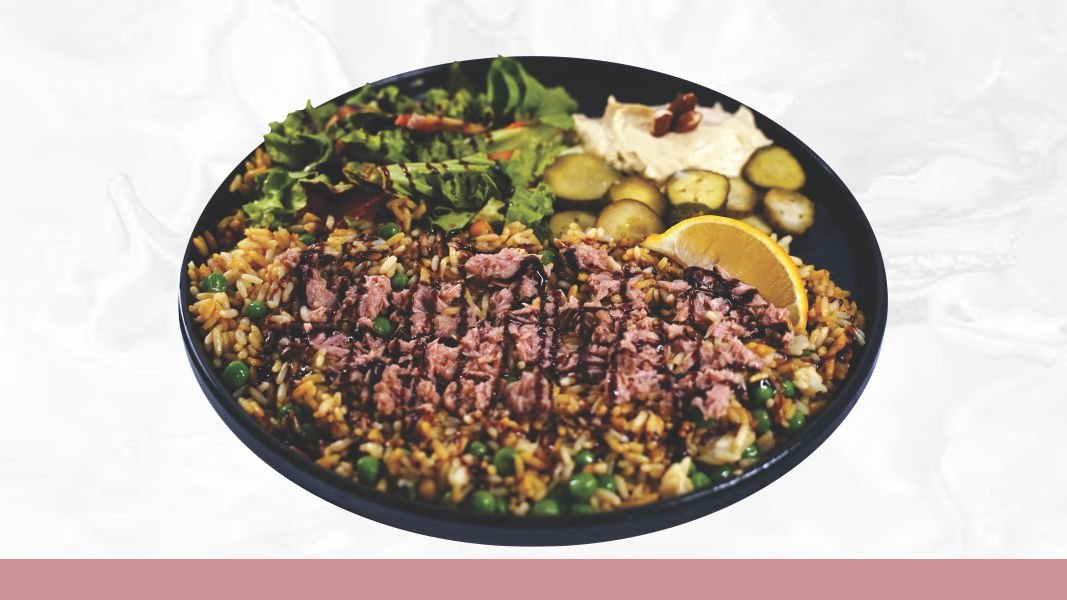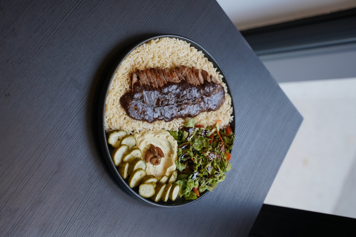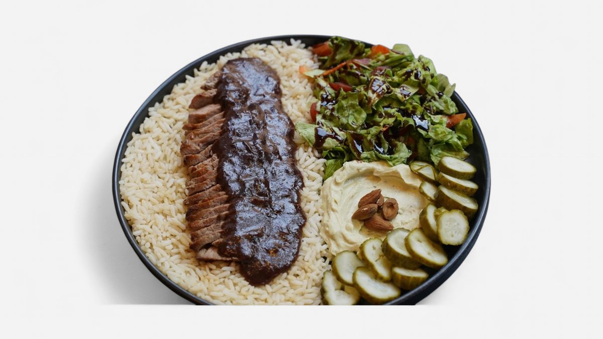 Pirinač, juneći ramstek u biber sosu, mix salata, humus, badem, kiseli krastavci