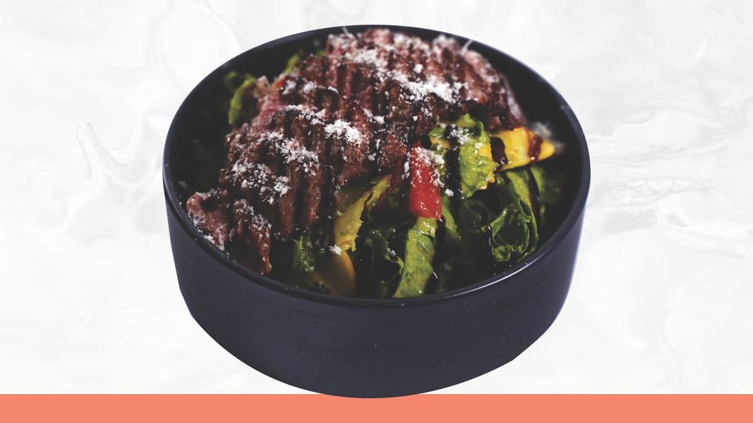 Juneći ramstek, pirinač, sos od šljiva i crvenog vina, humus, kiseli krastavci, badem, mix salata