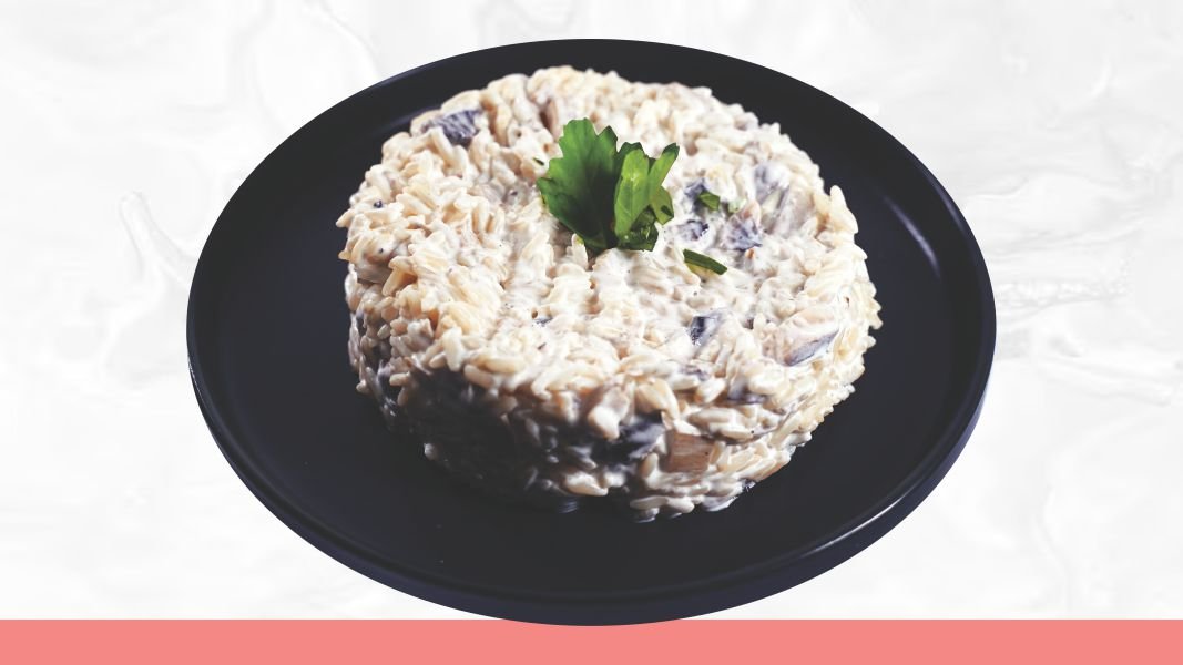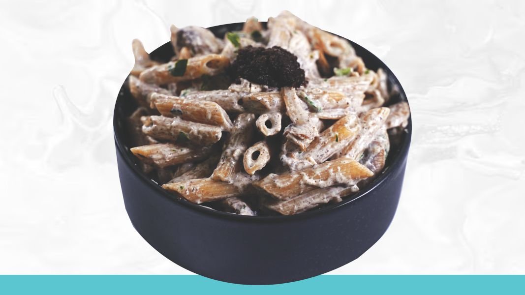 Integralna testenina, beli luk, pečurke, tartufata, veganska pavlaka, peršun