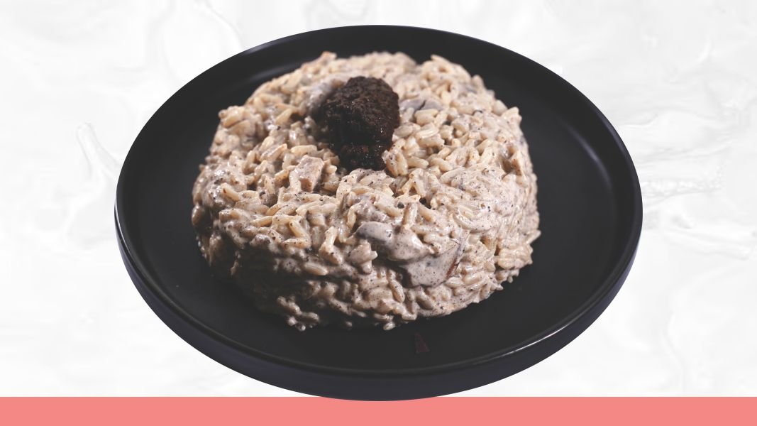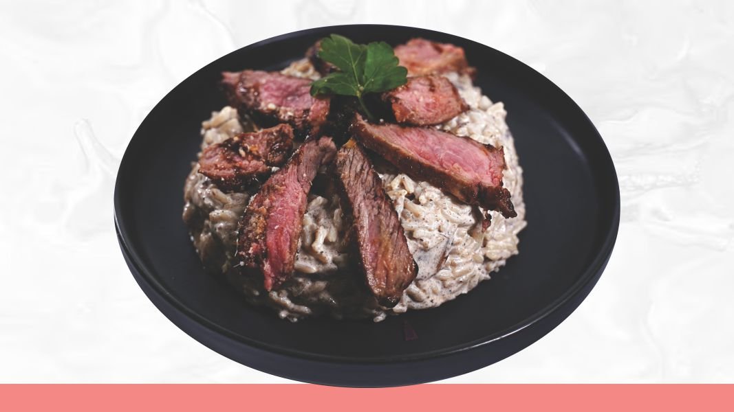 Integralna testenina, juneći ramstek, beli luk, pečurke, tartufata, veganska pavlaka, peršun, parmezan