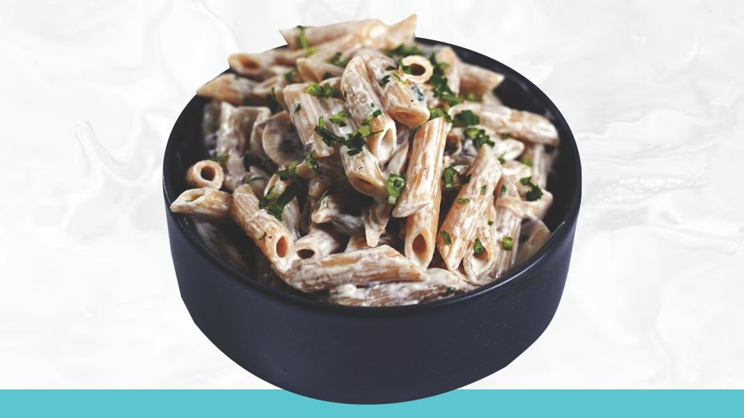 Integralna testenina, piletina, pečurke, peršun, veganska pavlaka, parmezan, biber