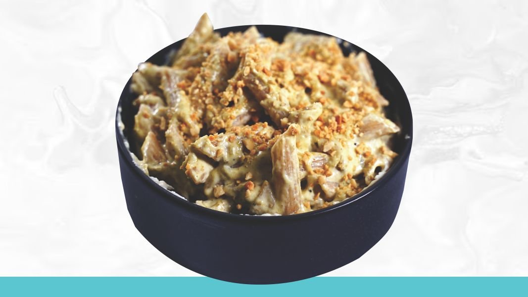 Integralna testenina,piletina, beli luk, pesto sos, veganska pavlaka, kikiriki, parmezan