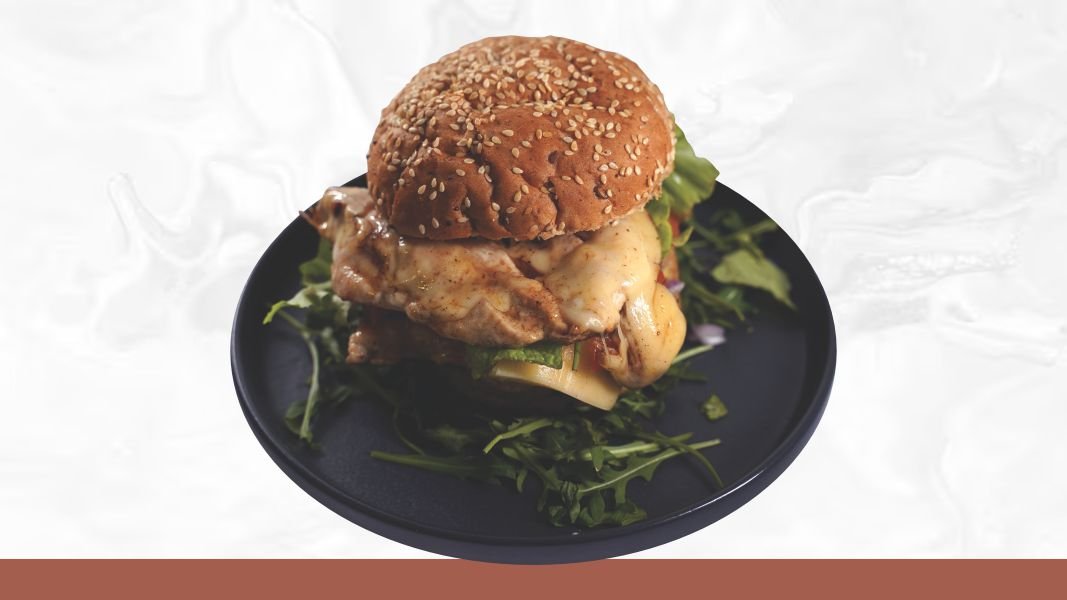 Zemička od punog zrna,2x pileći file, light tartar sos, crveni luk, paradajz, zelena salata, topi sir