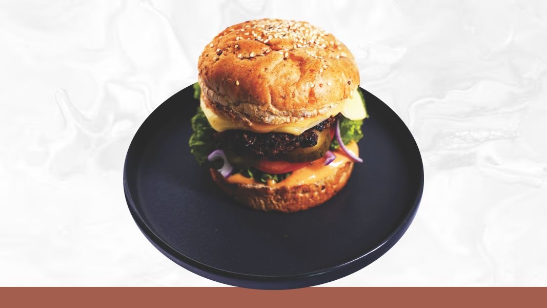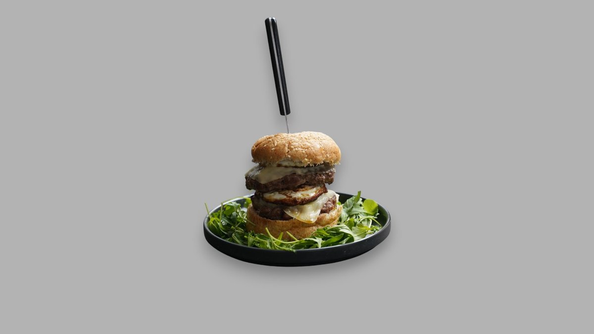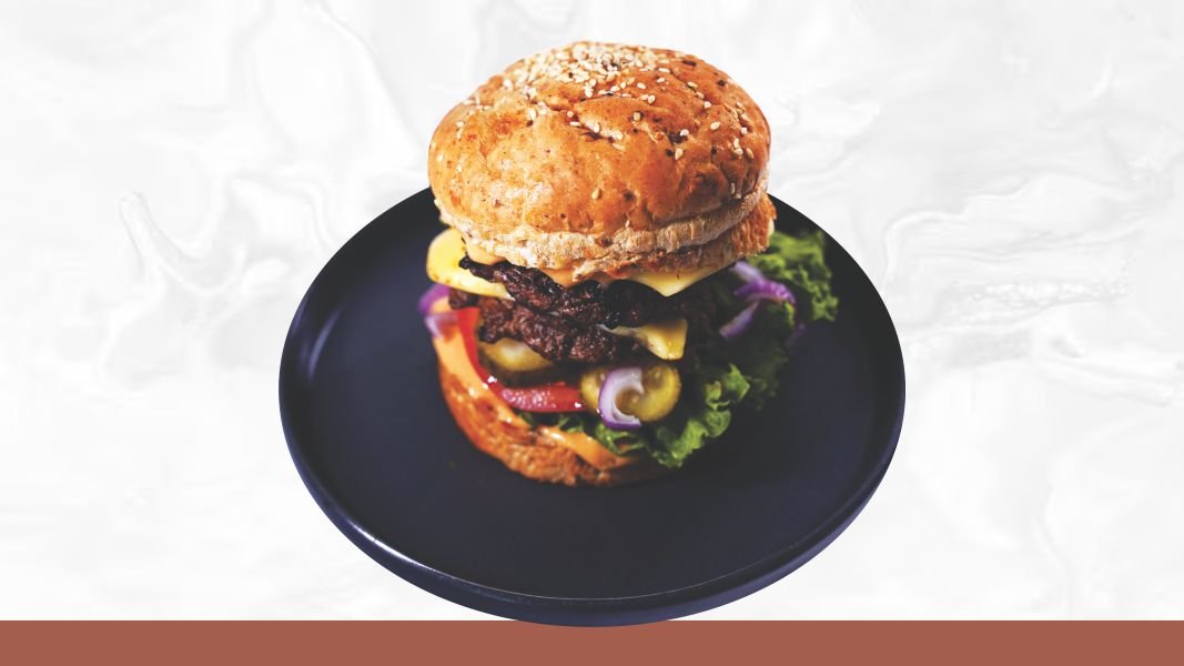 Zemicka od punog zrna, 2 x juneći burger, 2 x jaje na oko, 2 x chedar, kiseli krastavci, crveni luk