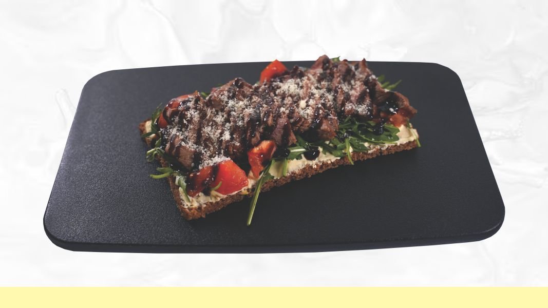 Punozrni hleb, humus, rukola, paradajz, ramstek, balzamico crema, parmezan