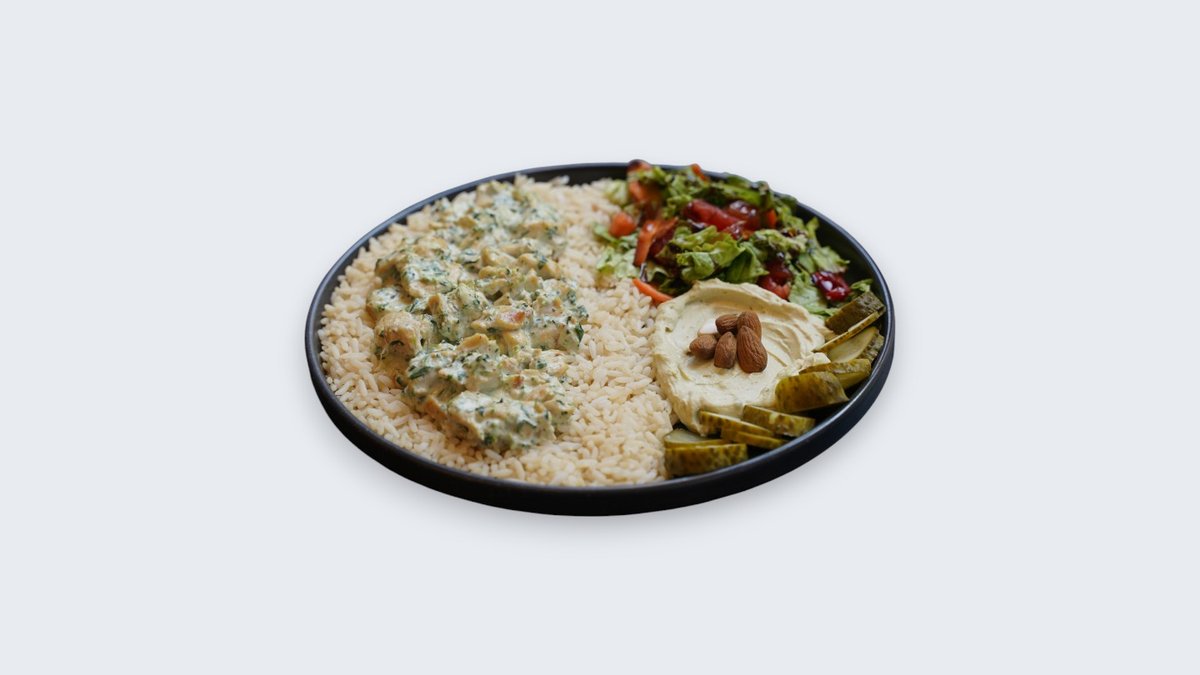 Piletina, pirinač,spanać,veganska pavlaka,humus,badem,kiseli krastavci,zelena salata