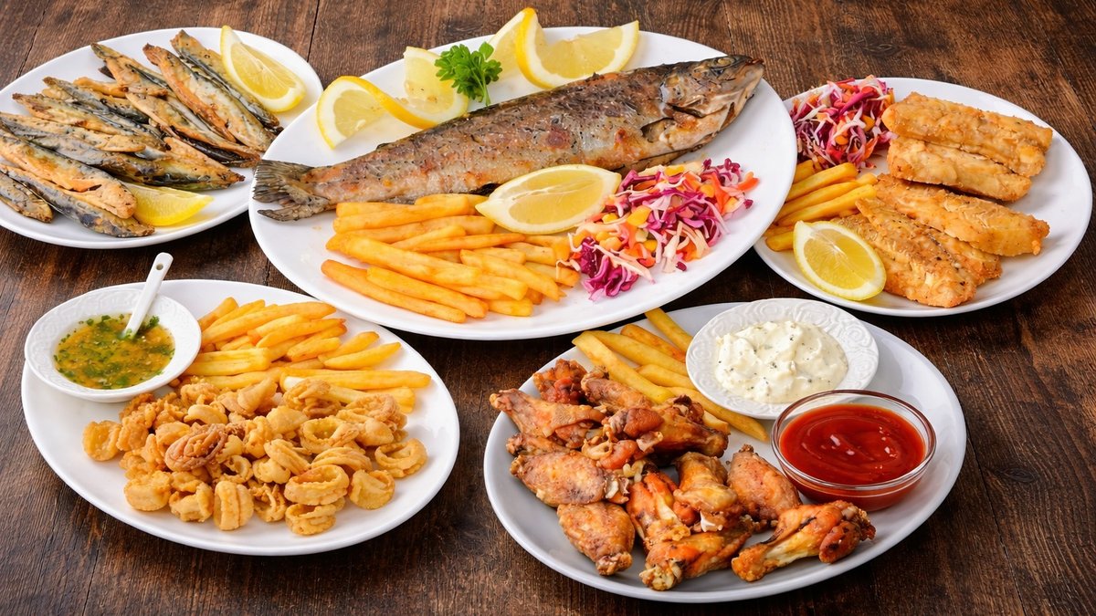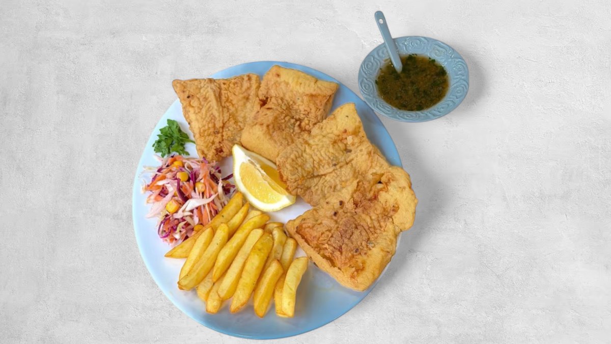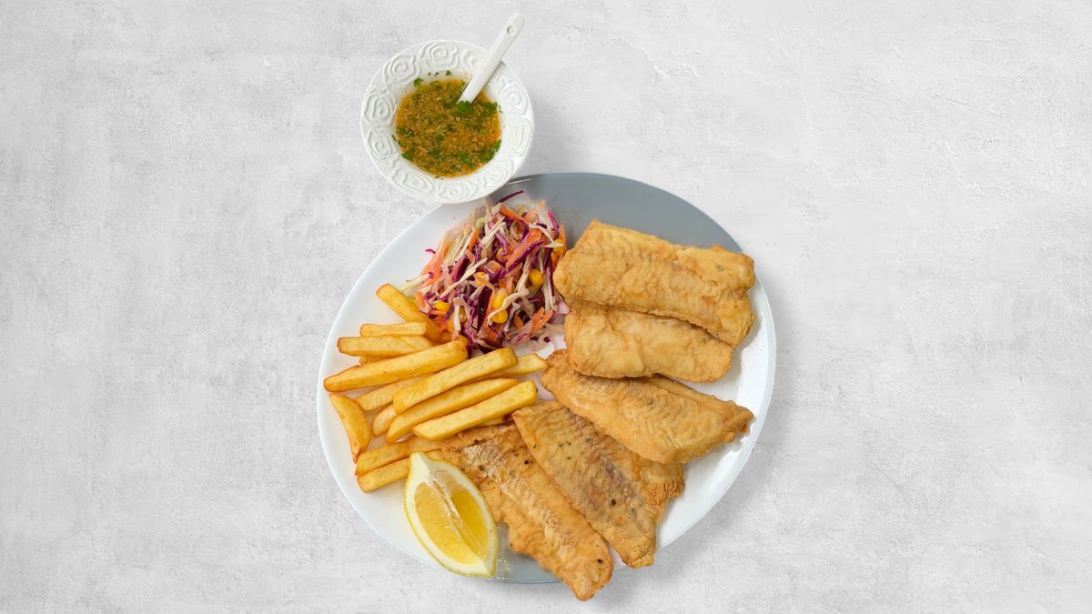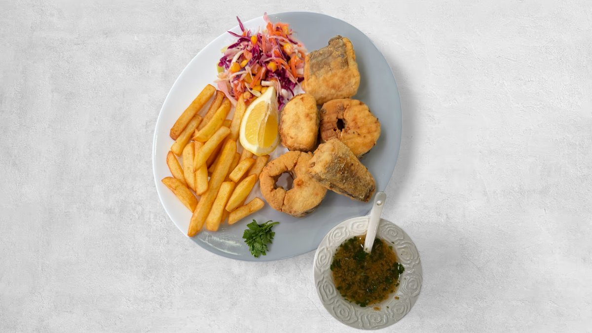 300g kotleta oslića, pomfrit, salata, marinada, limun