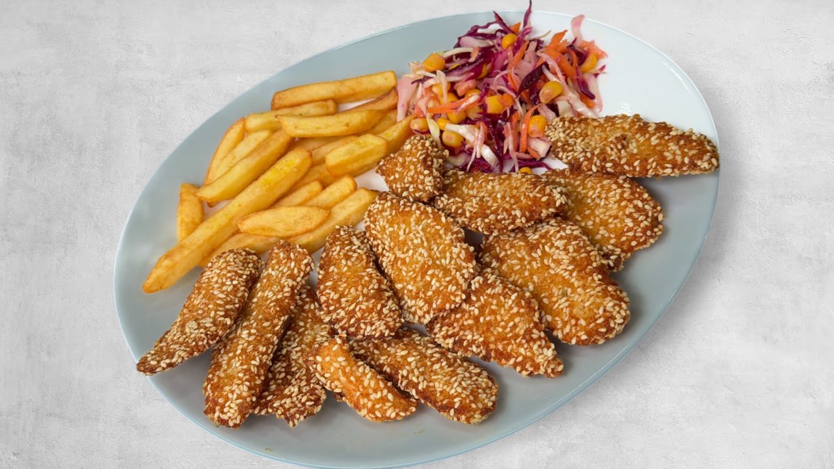 Pileći prstići sa susamom + pomfrit + sos po izboru