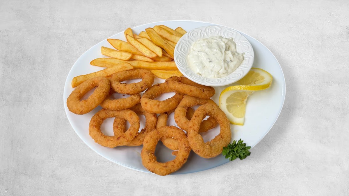 200g paniranog crnog luka, pomfrit, sos po izboru