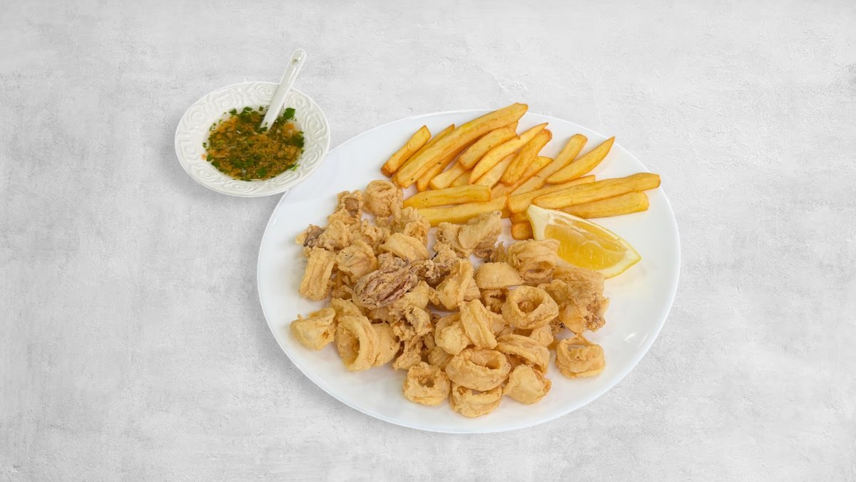 200g pohovanih lignji, pomfrit, marinada, limun
