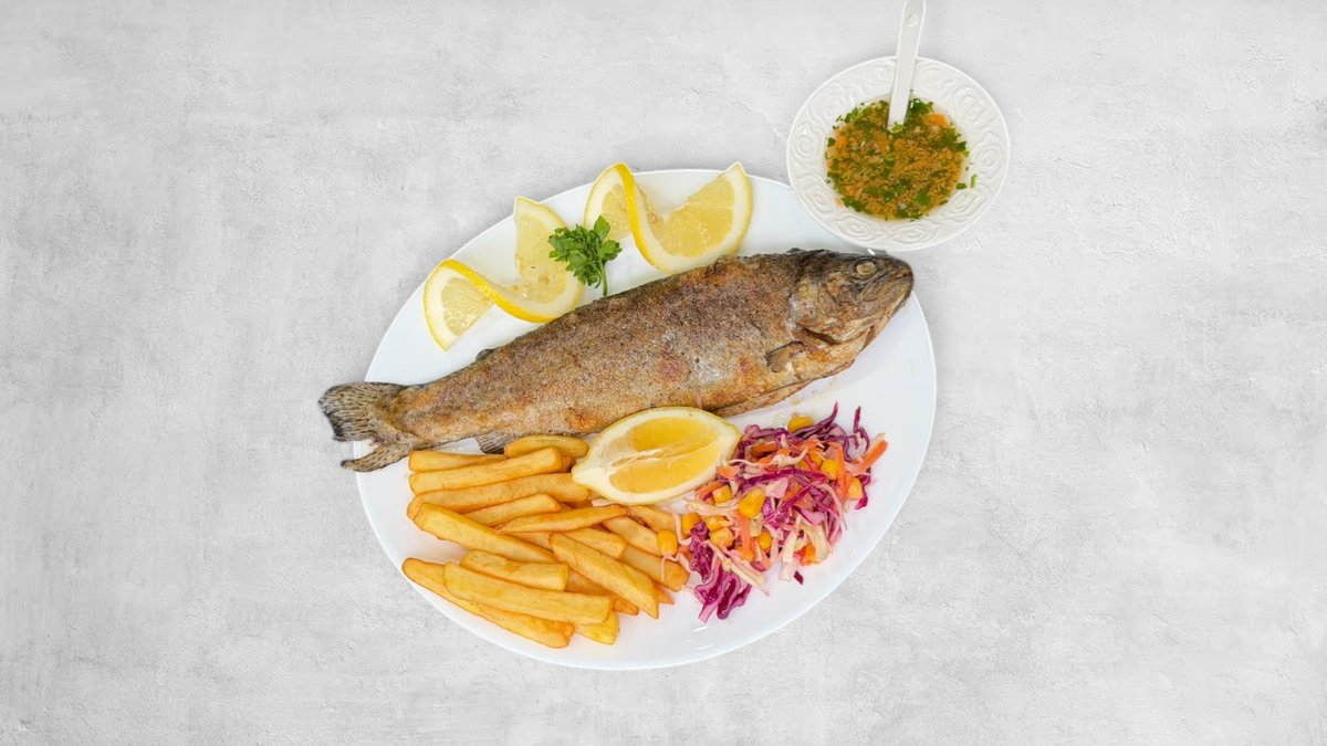 1 komad pastrmke 250–300g, pomfrit, salata, marinada, limun
