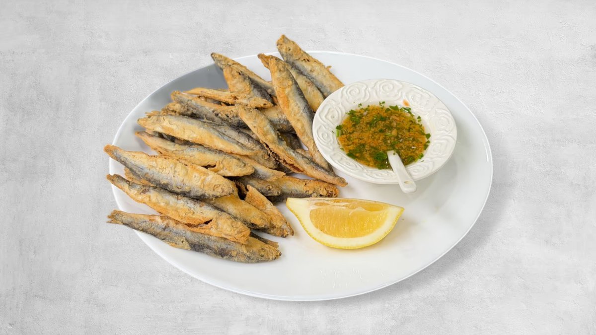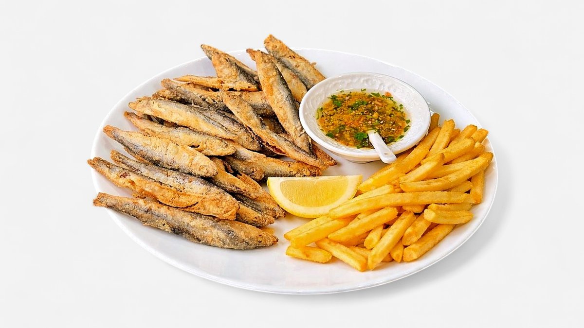 250g fileta oslića, pomfrit, salata, marinada, limun