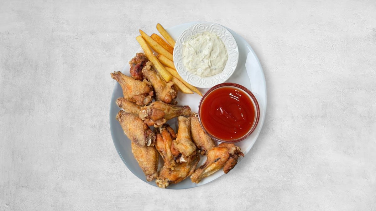 1kg pilećih krilca, 2 sosa po izboru. Napomena: navedena gramaža odnosi se na sirovu težinu proizvoda pre termičke obrade.