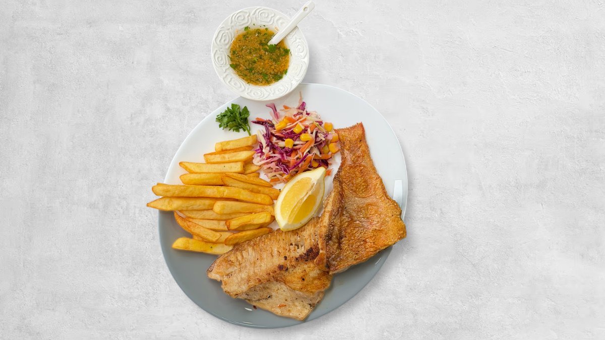 1 komad škarpine 250–300g, pomfrit, salata, marinada, limun