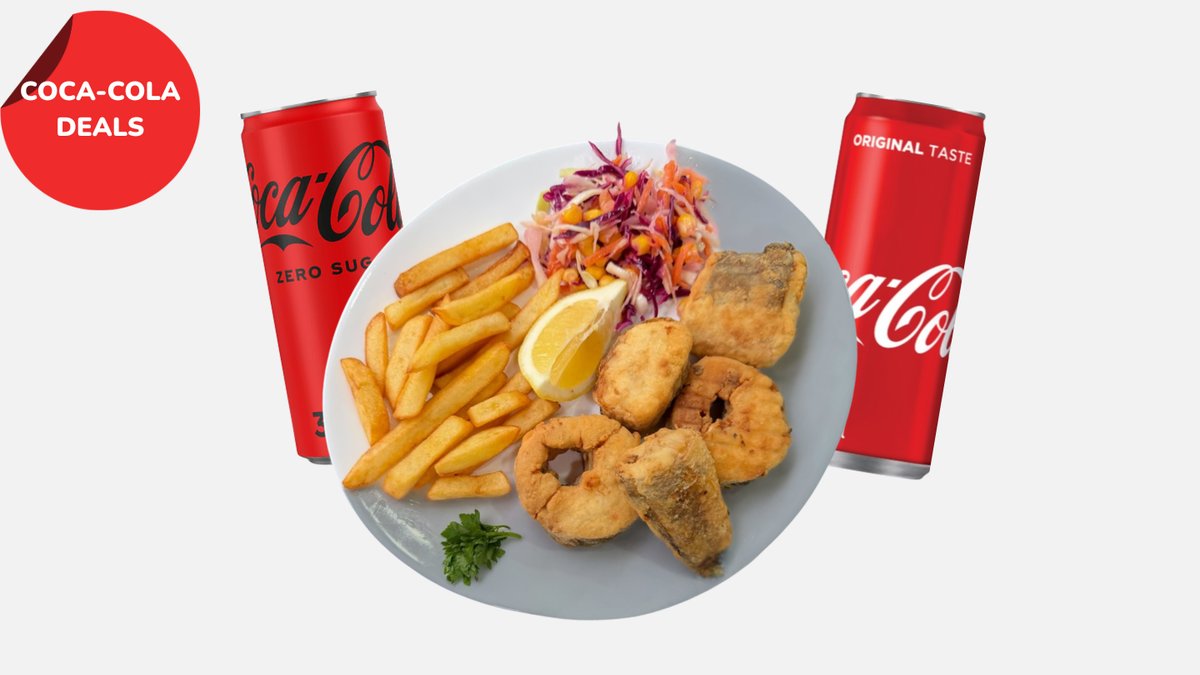 300g kotleta oslića, pomfrit, salata, marinada, limun + Coca-Cola 0.33l