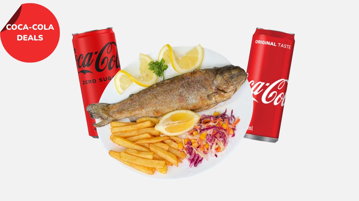 1 komad pastrmke 250–300g, pomfrit, salata, marinada, limun Coca-Cola 0.33l