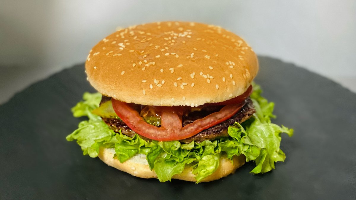 150 grama. Zemička sa susamom, burger sos, 100% govedja pljeskavica, luk, kiseli krastavčići, senf, kečap