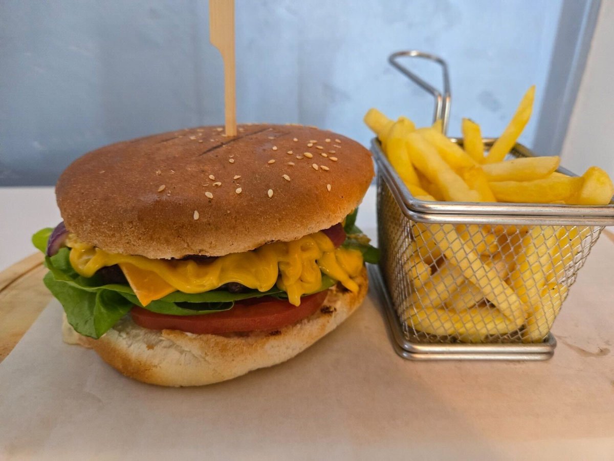Junetina 100% 150g, paradajz, kiseli krastavac, čedar, burger sos, zelena salata