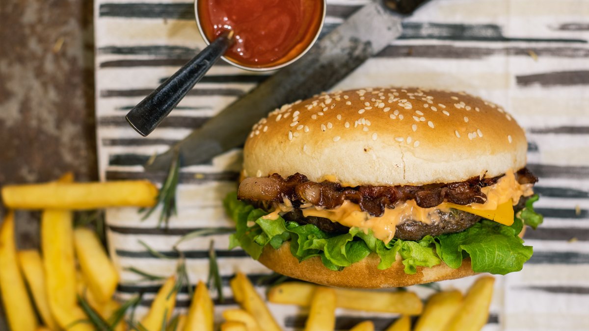 100% Angus beef, hrskava slanina, džem od luka, iceberg salata, kiseli krastavčići, senf, bbq sos, pomfrit sa strane