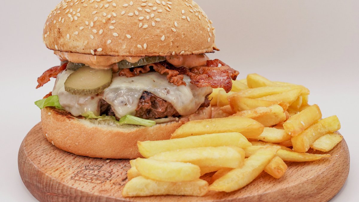 Zemička, 2x 100g burgera, 2x sir, slanina, burger sos, pomfrit