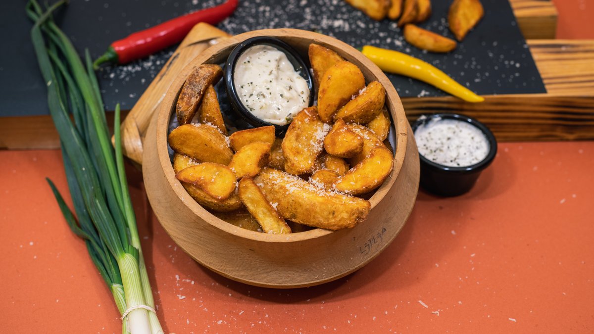 Tortilja, zelena salata, paradajz, pileći file, slanina, crveni luk, tartar sos, pomfrit, vitaminska