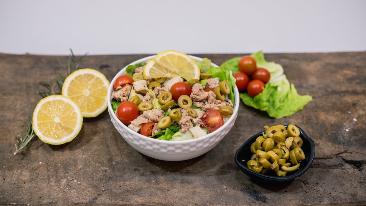 Zelena salata, tunjevina, čeri paradajz, masline, kubeti, kriške limuna, balsamico, maslinovo ulje