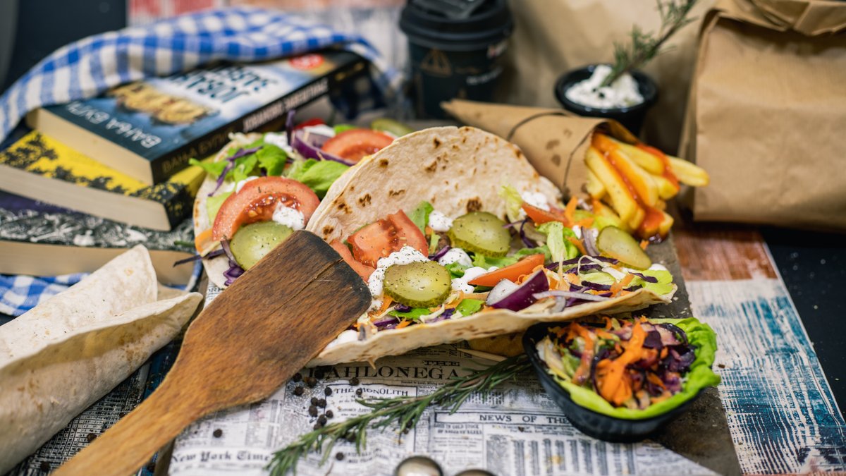 Tortilja, zelena salata, dimljena junetina, grilovano povrce, šećerac, feferoni, čili, senf, pomfrit, vitaminska salata