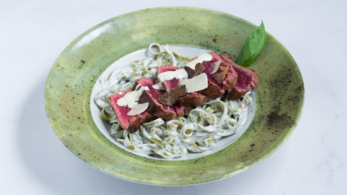Biftek sa taljatelama od spanaća i sosom od tartufa sa listićima grano padana i tartufa 400g
