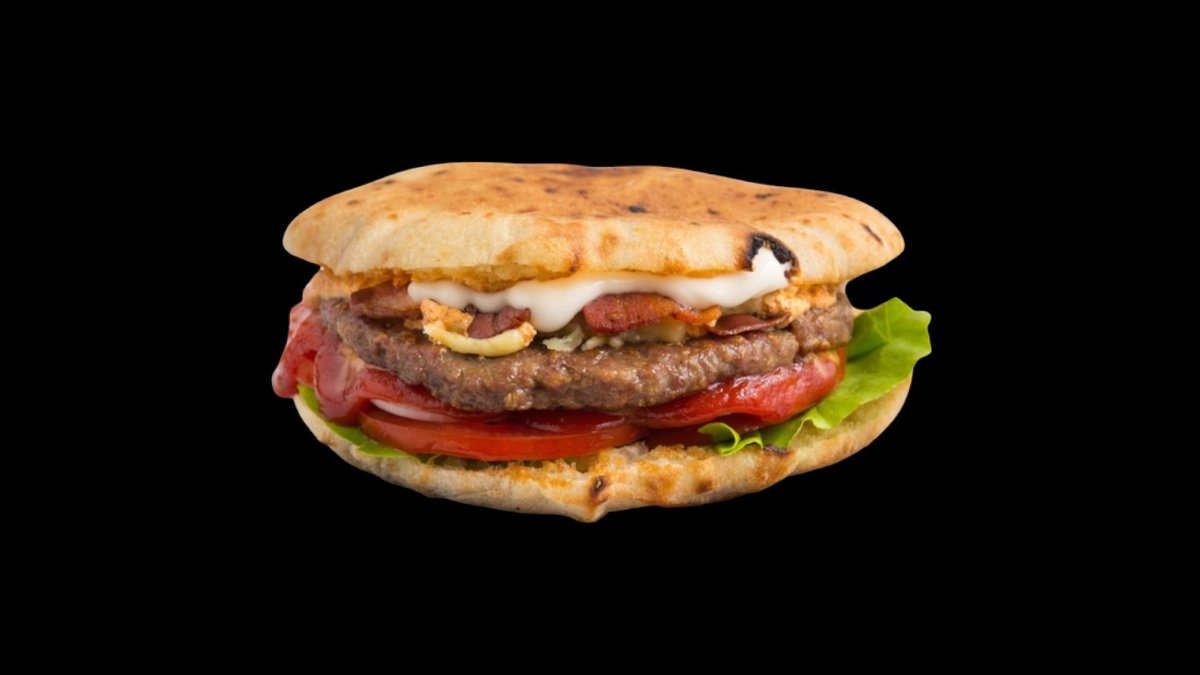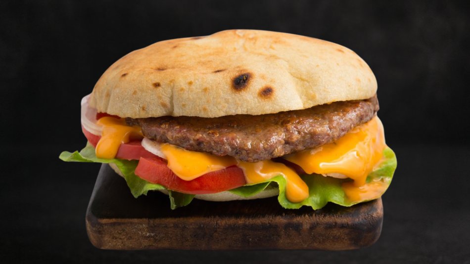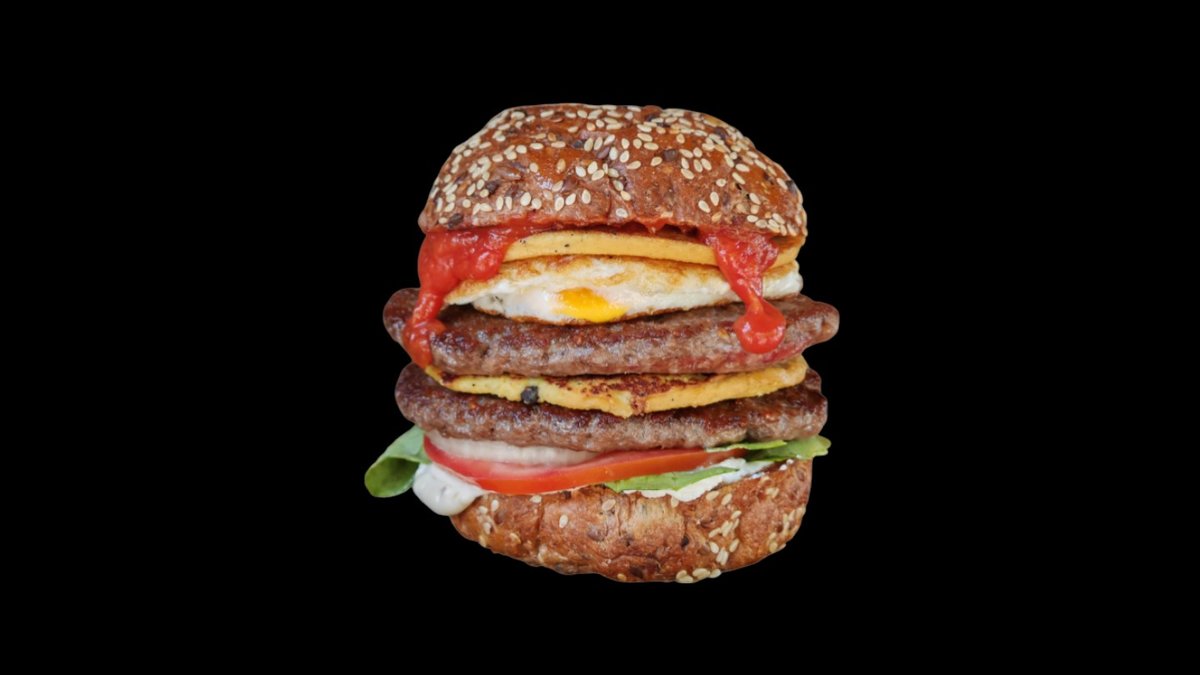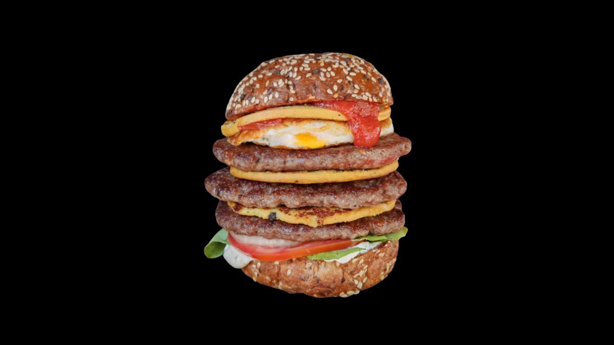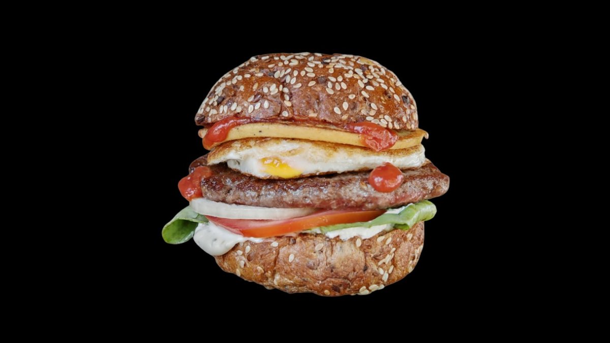low carb proteinska zemička, 3x 100% junetina, jaje, 3x proteinski sir od badema, light meyo sos od tartufa, low fat sirni namaz, heinz kečap sa 50% manje šećera, zelena salata, paradajz, luk. kcal: 820, m:40, uh:11, P: 78