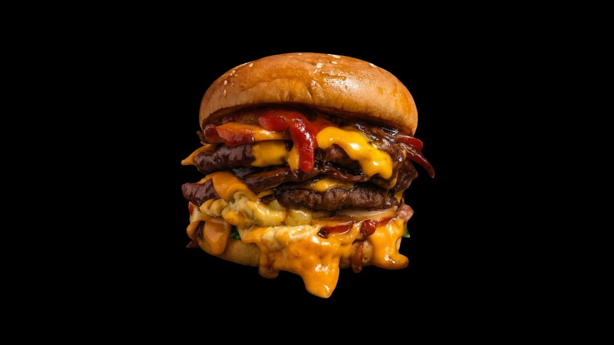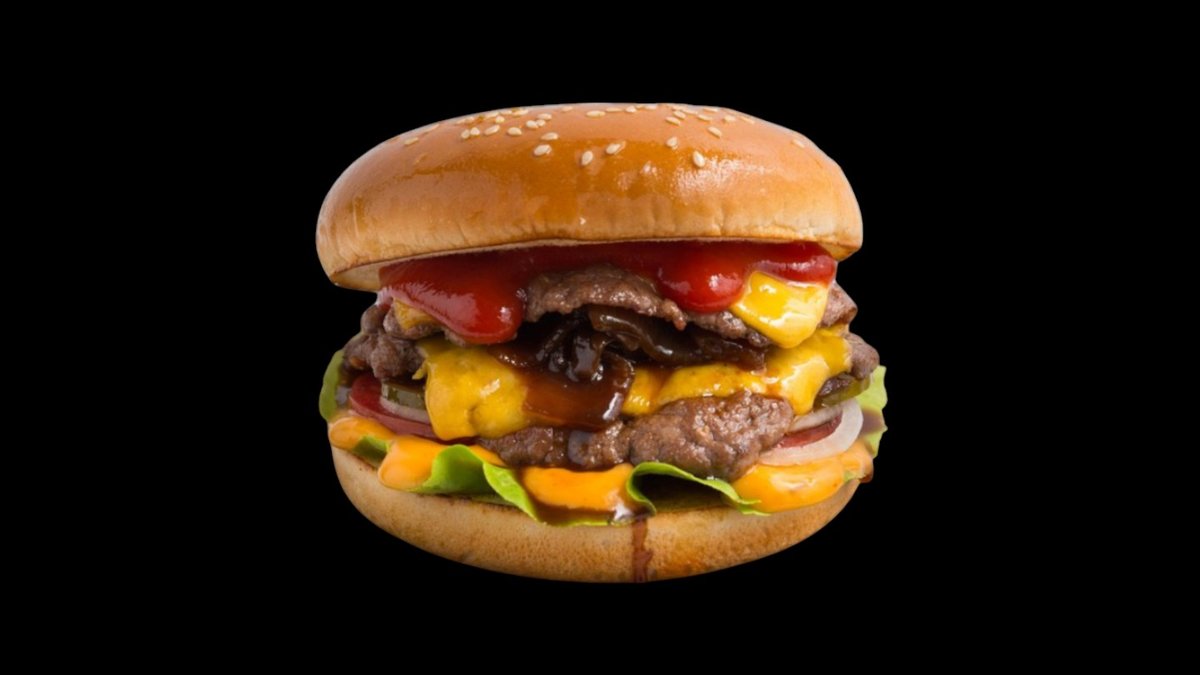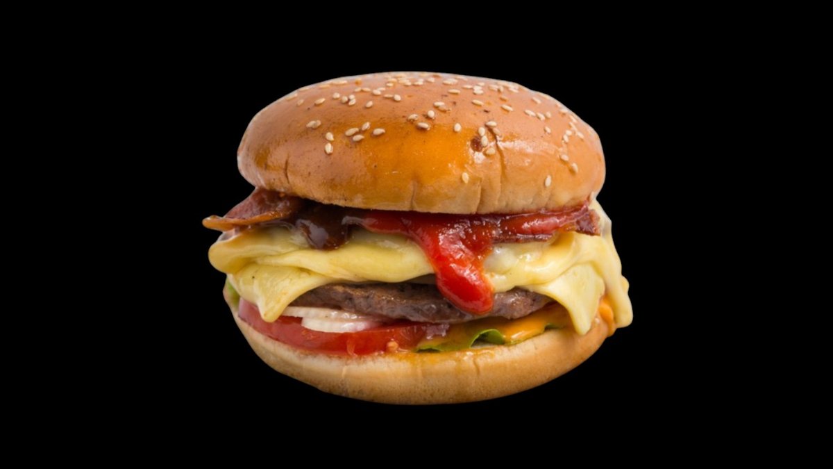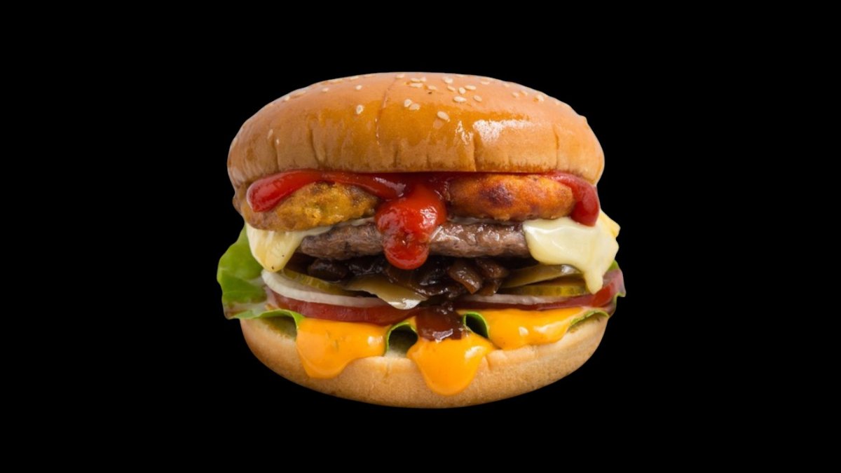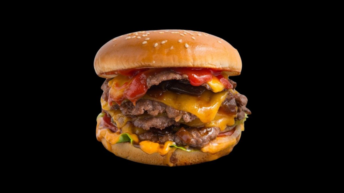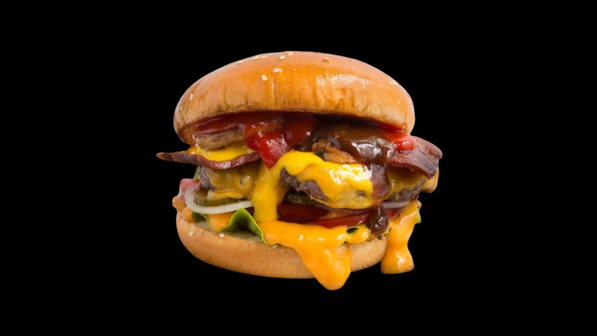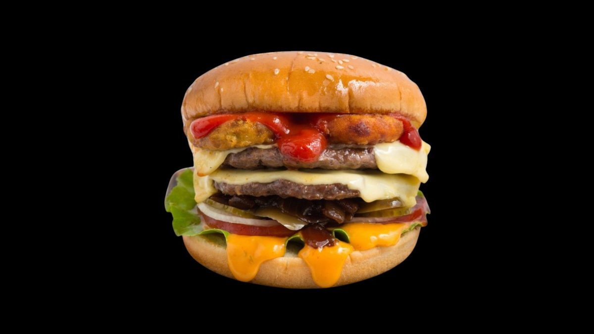 Puter zemička, 100% Juneće meso x 2, Kačkavalj x 2, Slanina, Brgr sos, Kentaki sos, Paradajz, Luk, Kiseli krastavac, Zelena salata, Heinz kečap