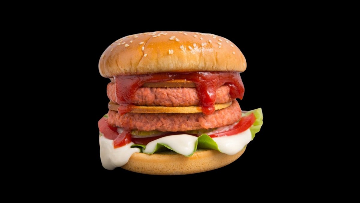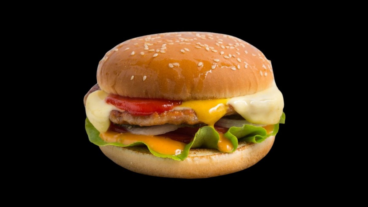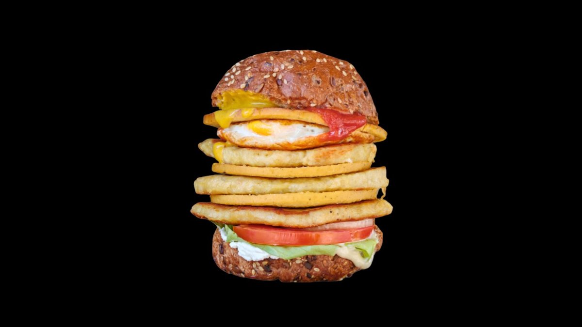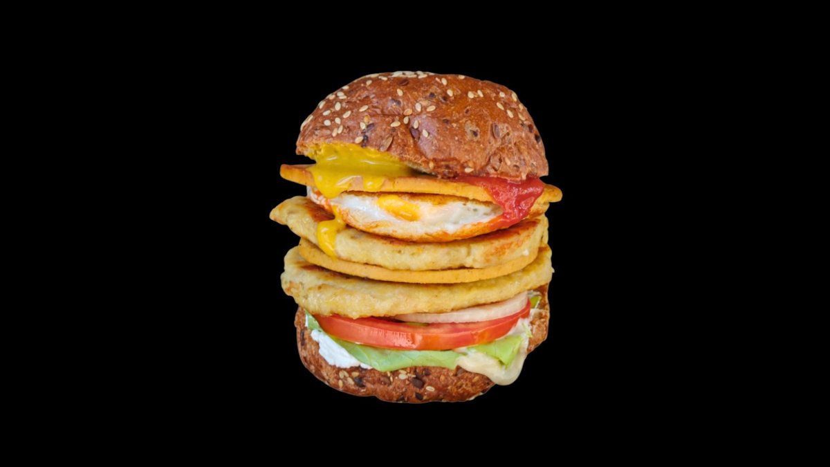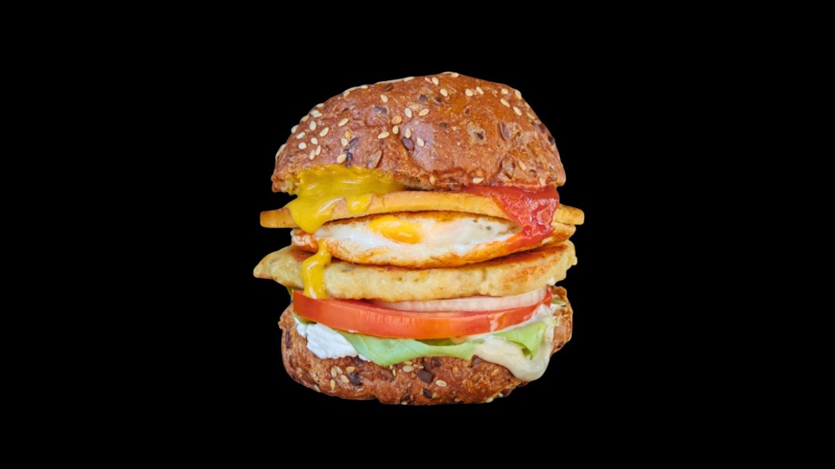 Zemička, Vege meso x2, Dimljeni sir od badema x2 Posni brgr sos, Paradajz, Luk, Kiseli krastavac, Zelena salata, Heinz kečap