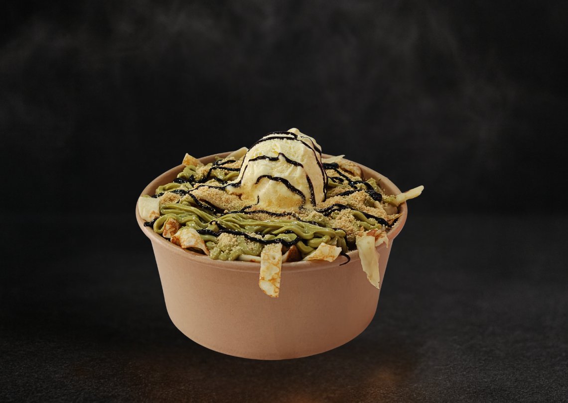 Špageta palačinka, pistać krem, plazma, sladoled od vanile, toping čokolada