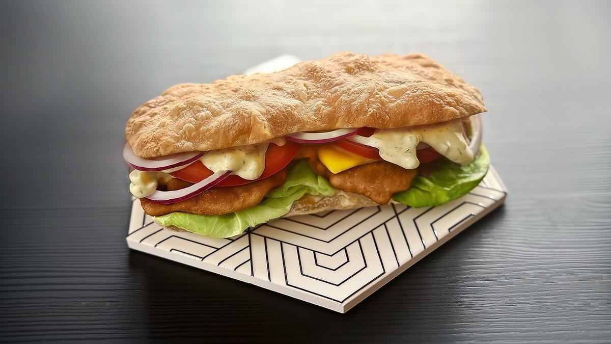 Ciabatta, pohovani prženi pileći file, kari sos od kuvara, čedar sir, paradajz, crni luk