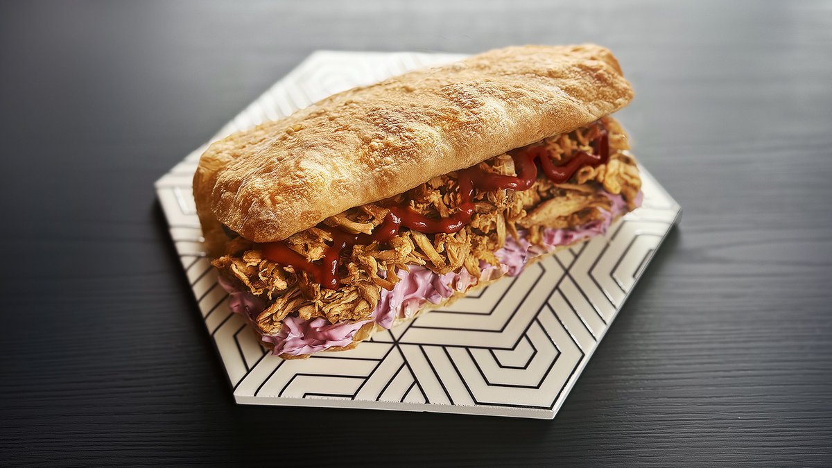 Ciabatta, svinjetina dinstana u rerni, BBQ sos, salata coleslaw