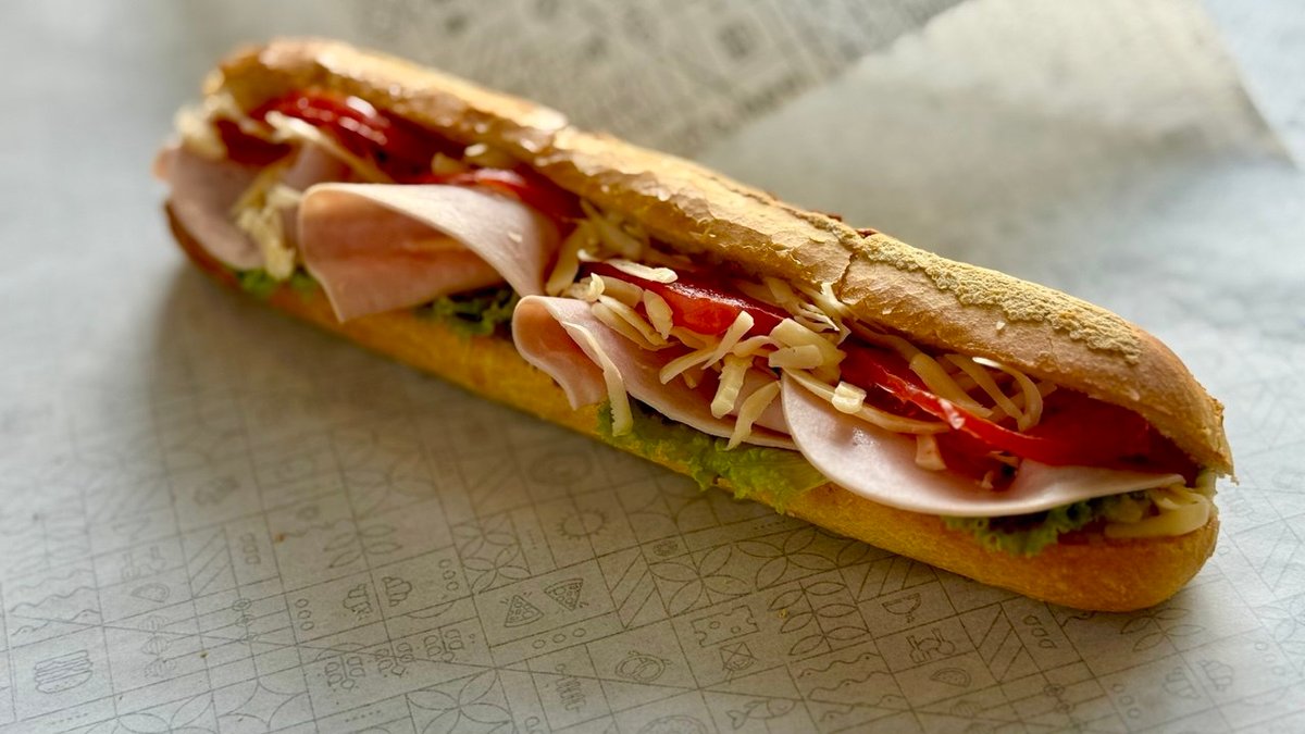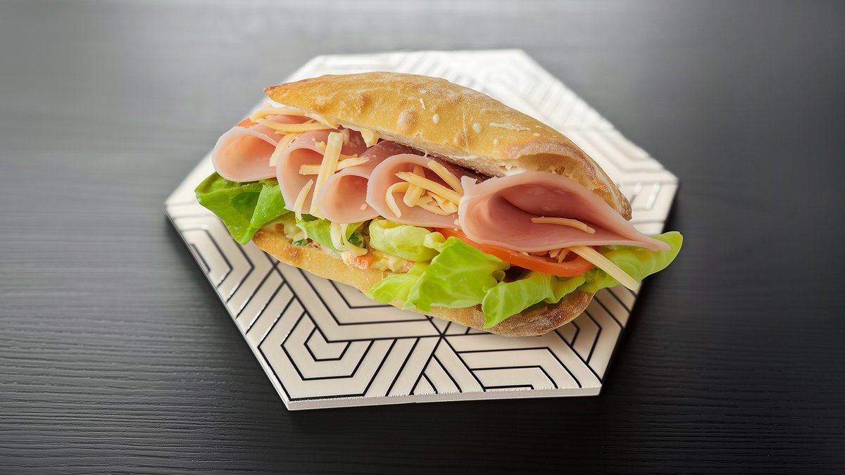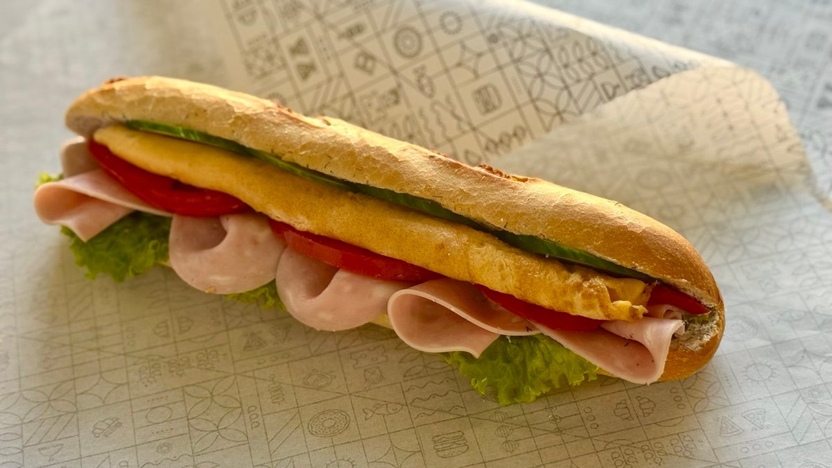 Baget, šunka, gouda sir, zelena salata, paradajz, ruska salata, krastavac, sos