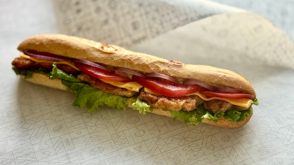 Baget, pohovani prženi pileći file, kari sos od kuvara, čedar sir, paradajz, crni luk