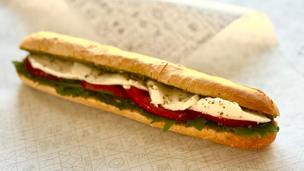 Baget, mocarela sir, paradajz, rukola, pesto sos, origano