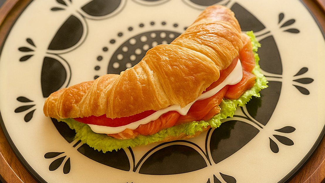 Veliki kroasan (70g) punjen blago posoljenim lososom, paradajzom, zelenom salatom i senf-majonez sosom