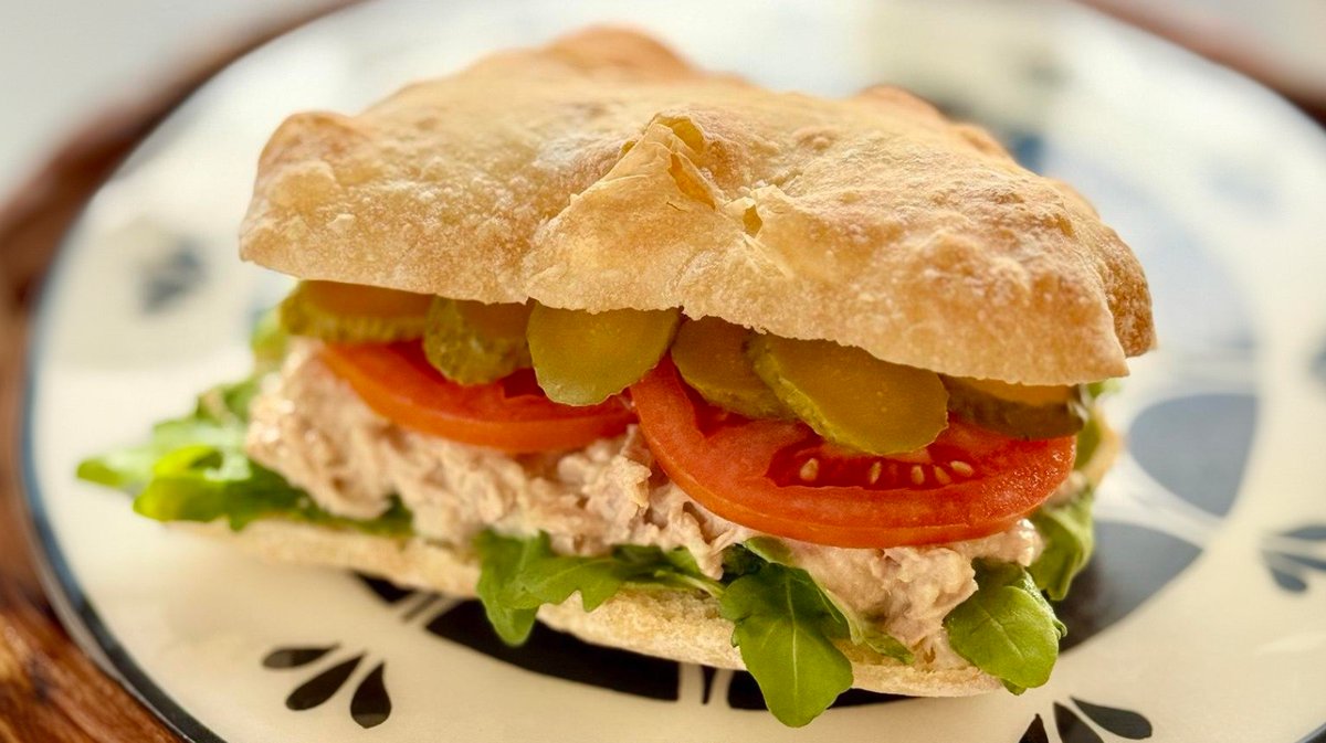 Tunjevina, posna pasulj-pasta, rukola, paradajz i marinirani krastavčići. Bez mesa i mlečnih proizvoda.