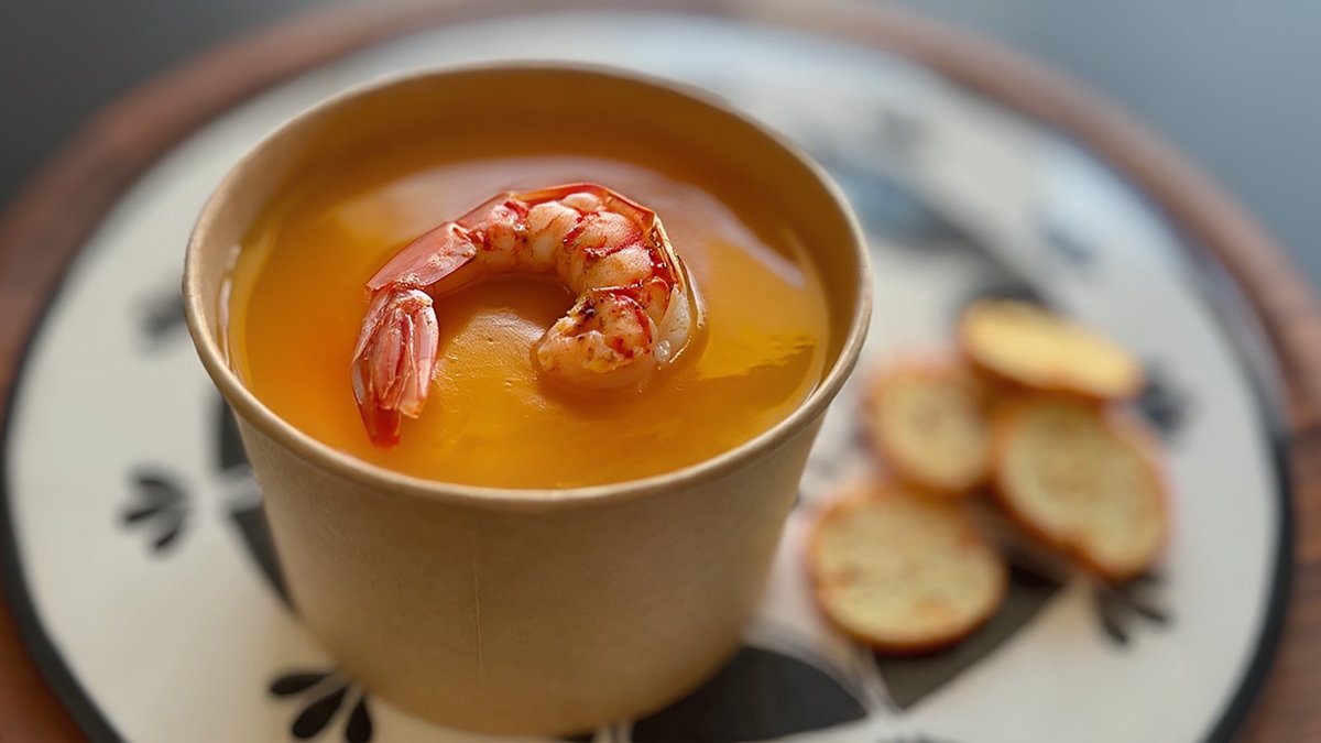 Supa od bundeve sa kokosovim mlekom i karijem sa argentinskim škampima i krutonima