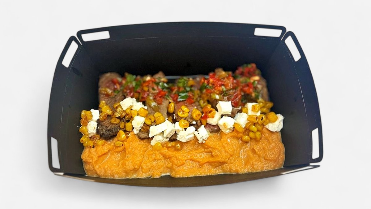 Ramstek u čimičuri sosu na pireu od batata sa fetom i grilovanim kukuruzom