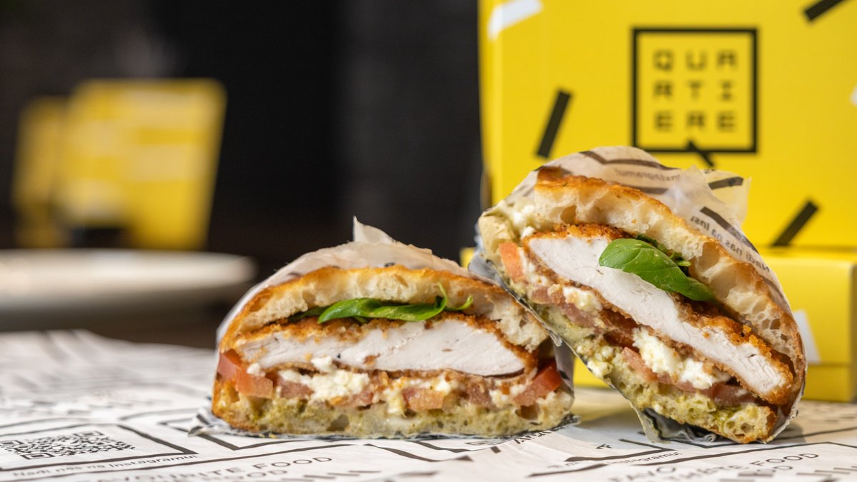 Pesto od bosiljka, svež paradajz, bivolja mocarela, panirana piletina , maslinovo ulje.