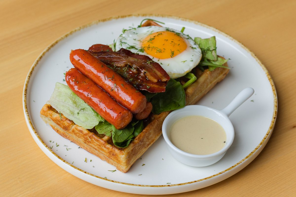 Špinatna vafla sa mortadellom, poširano jaje i pikantnim sirom namazom