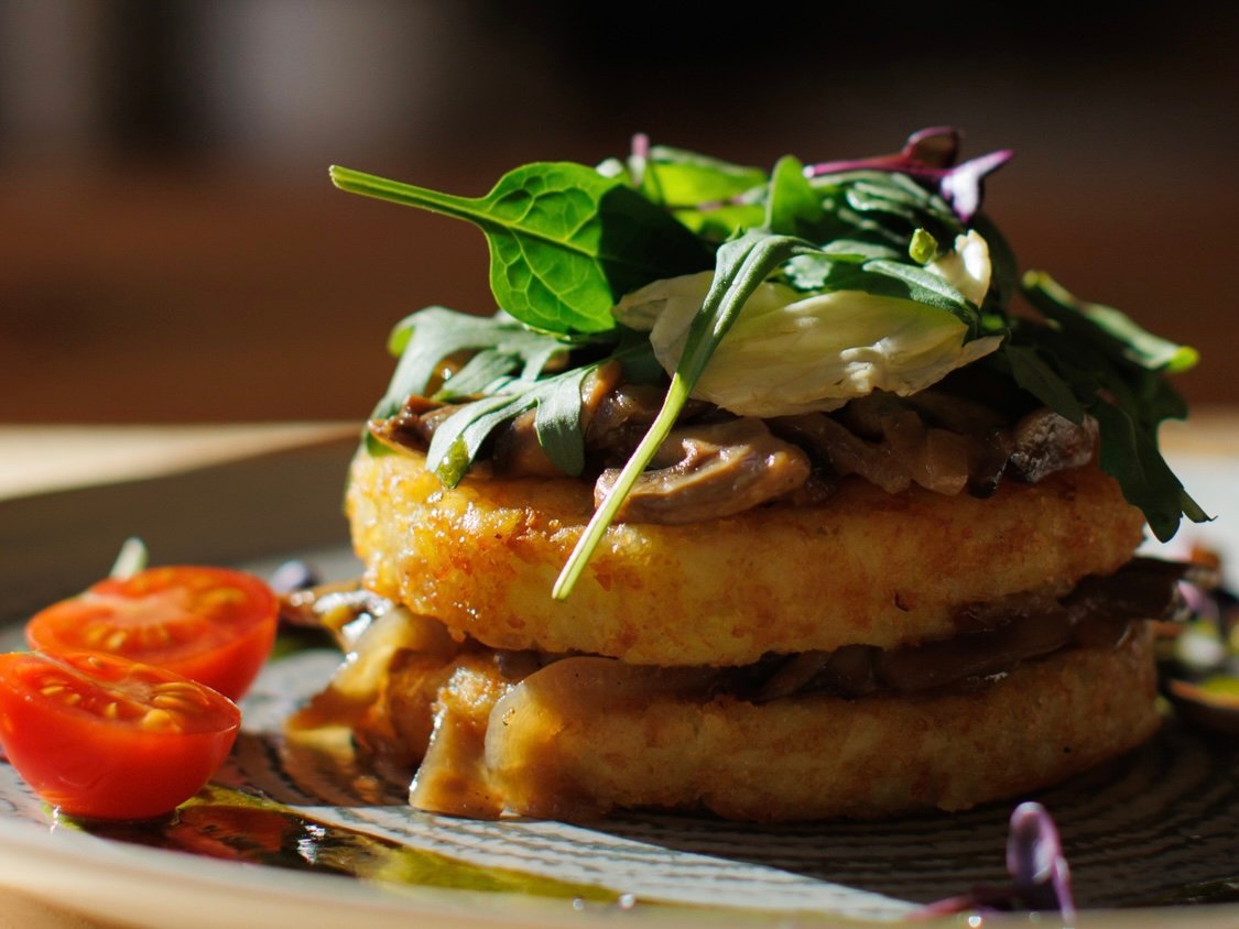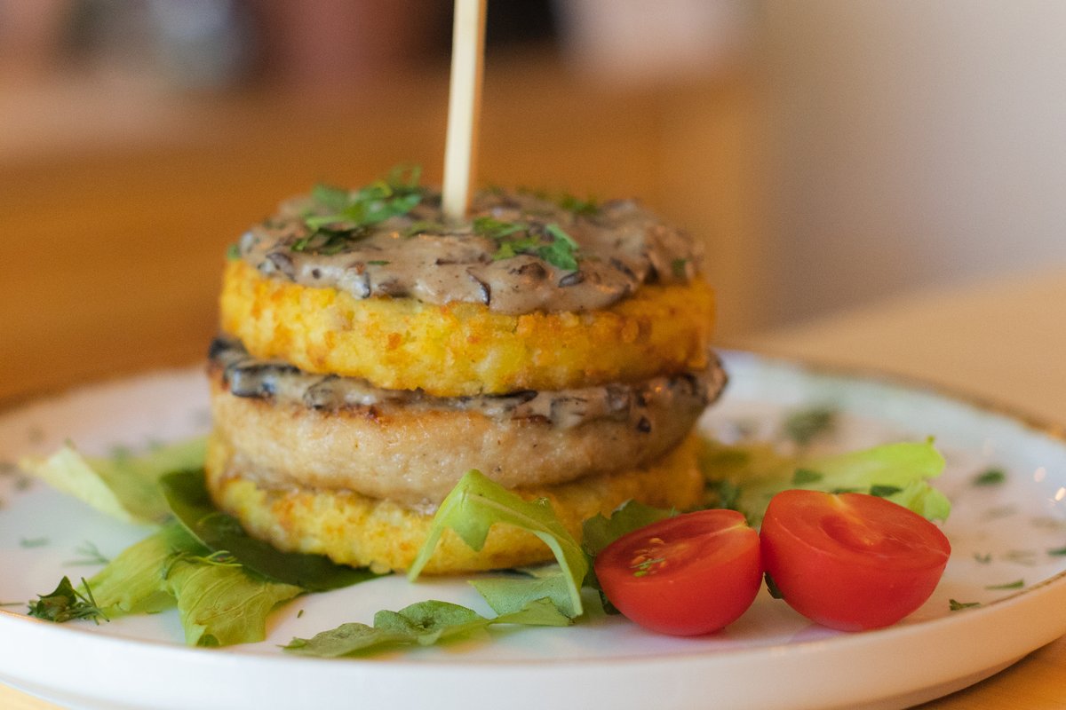 Krompirni hašbraun, pileća pljeskavica, sos od pečuraka i pavlaka