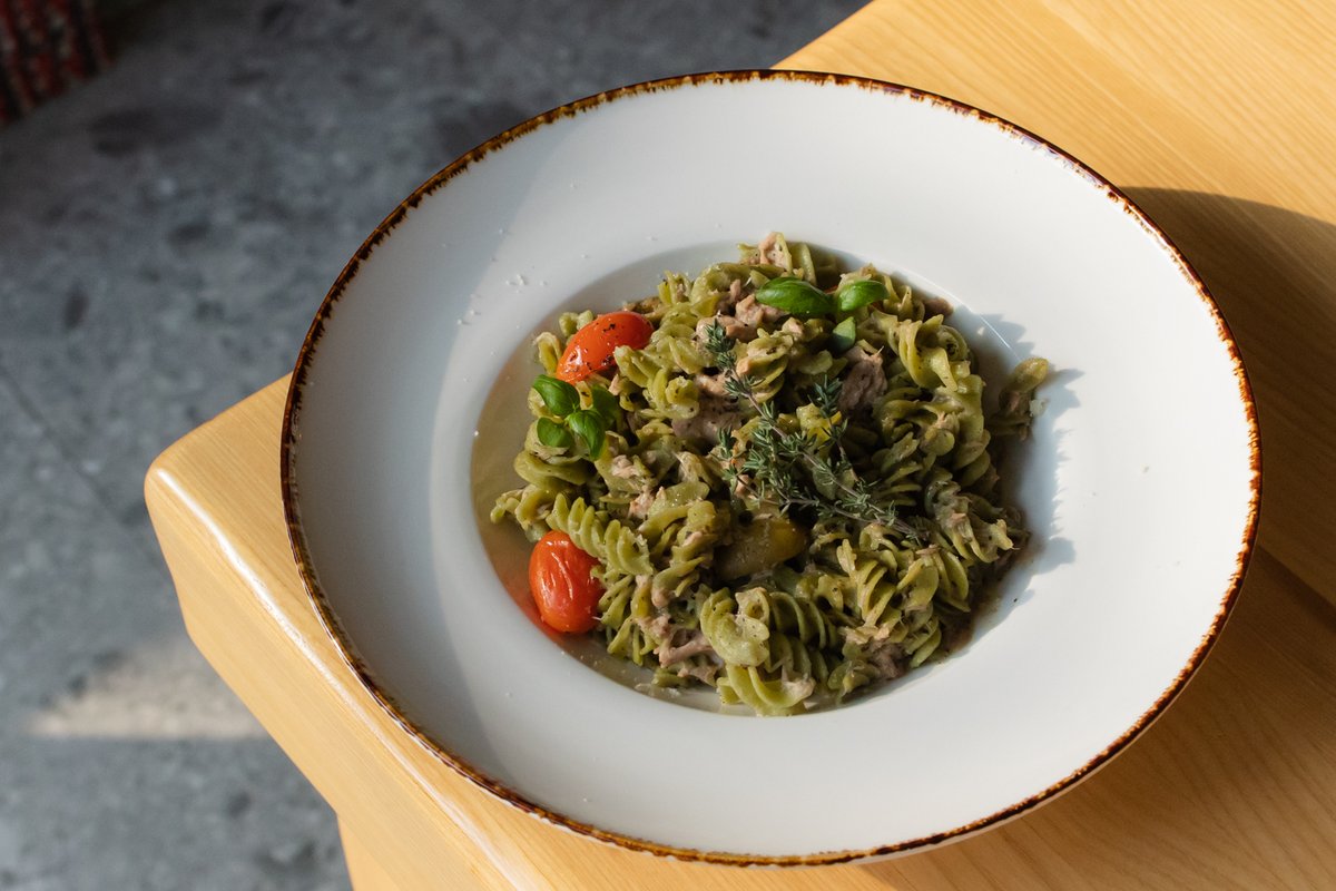 Špinatna Pasta bez glutena, tuna, masline, paradajz, sveže začinsko bilje